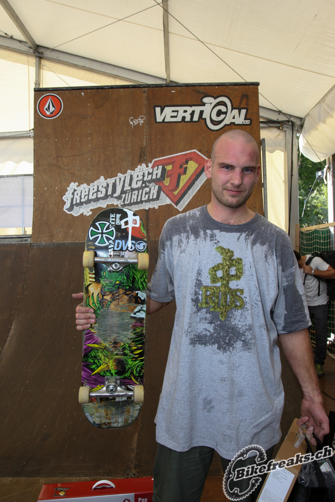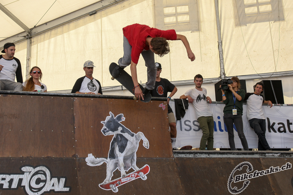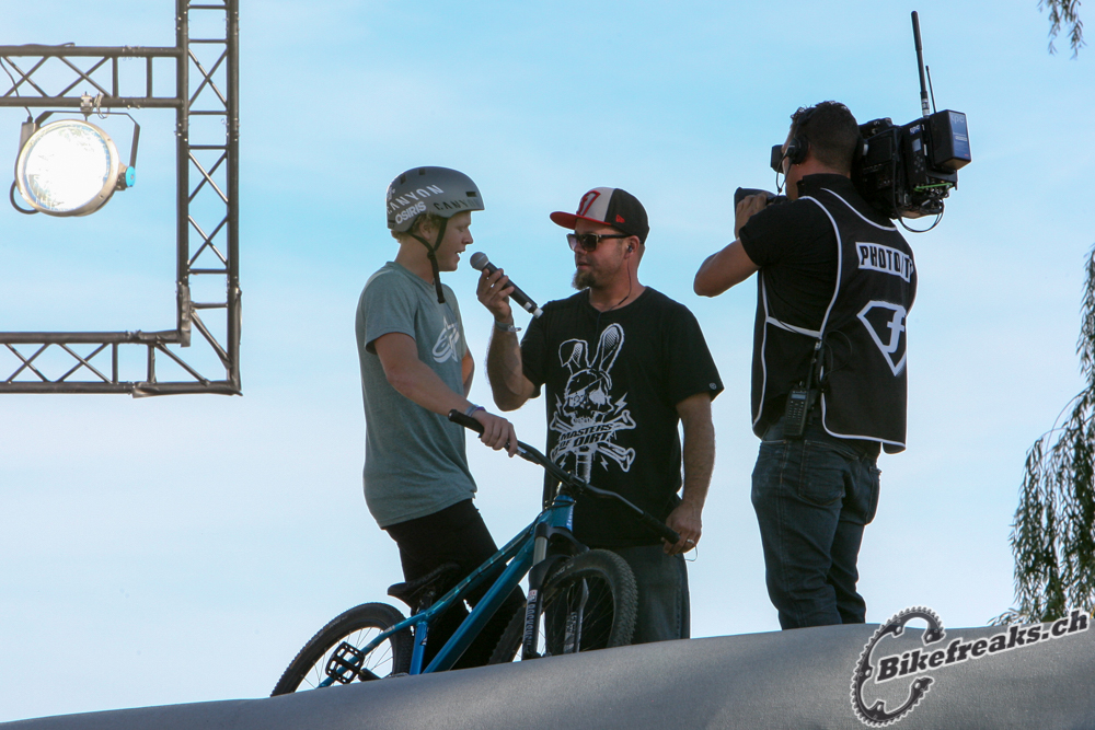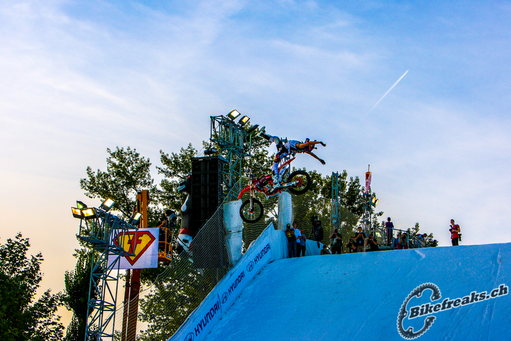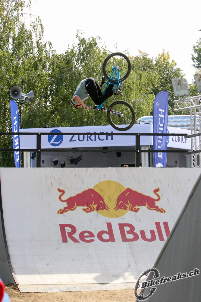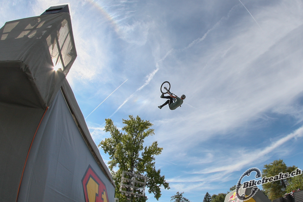 Der 19-jährige Schwedische Bike Star Anton Thelander konnte sich gegen ein Stakes Fahrerfeld durchsetzten. Der Junge zeigte ein geniales Trick-Feuerwerk: Truckdriver, Backflip Tailwhip und Flair! Er war der verdiente Sieger an diesem tag auf der grossen BigAir Bike Rampe!