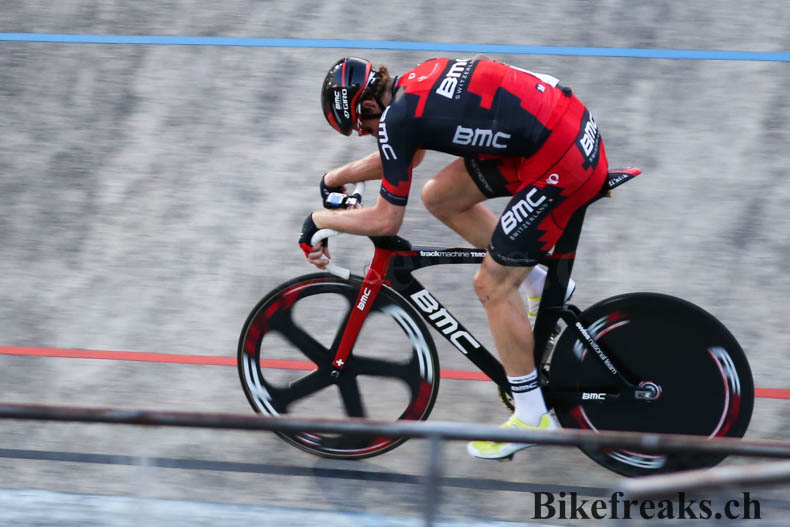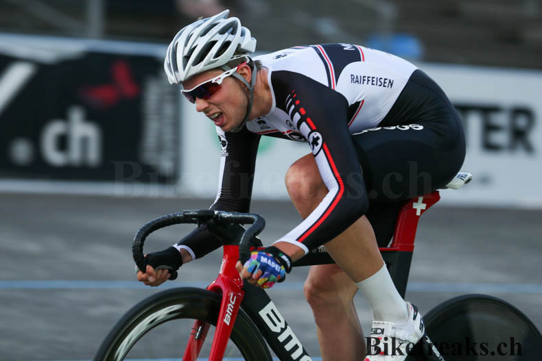 Dann kam es zum Highlight des Abends. Das Punktefahren der Elite. Dabei ging es um den Sieg der Verbandsmeisterschaft. Ein packendes Rennen über 90 Runden, mit 15 Wertungen. Tristan Marguet und Stefan Küng holten sich je fünf Wertungssiege. Es war ein packendes Rennen. Stefan Küng zeigte eine starke Leistung und holte sich gleich zwei Wertungen in Folge solo! Das Publikum dankte ihm diesen Effort mit lautem Applaus. Doch auch Tristan Marguet, zu Beginn eher zurückhaltend drehte gegen Ende des Rennens mächtig auf. Etwas zu spät, wie sich am Schluss zeigen sollte. Er wurde mit zwei Punkten Rückstand auf Stefan Küng zweiter. Nur vier Punkte hinter ihm erneut Cyrille Thièry, der seine gute Form an diesem Abend bestätigte. Mit einem Stundenmittel von 48,7 Km/h kamen die Fahrer ins Ziel. Das war Bahnrennsport vom feinsten!
