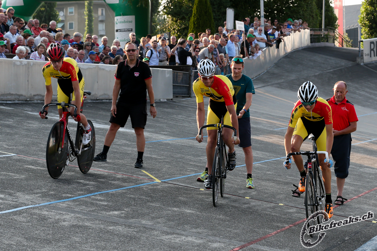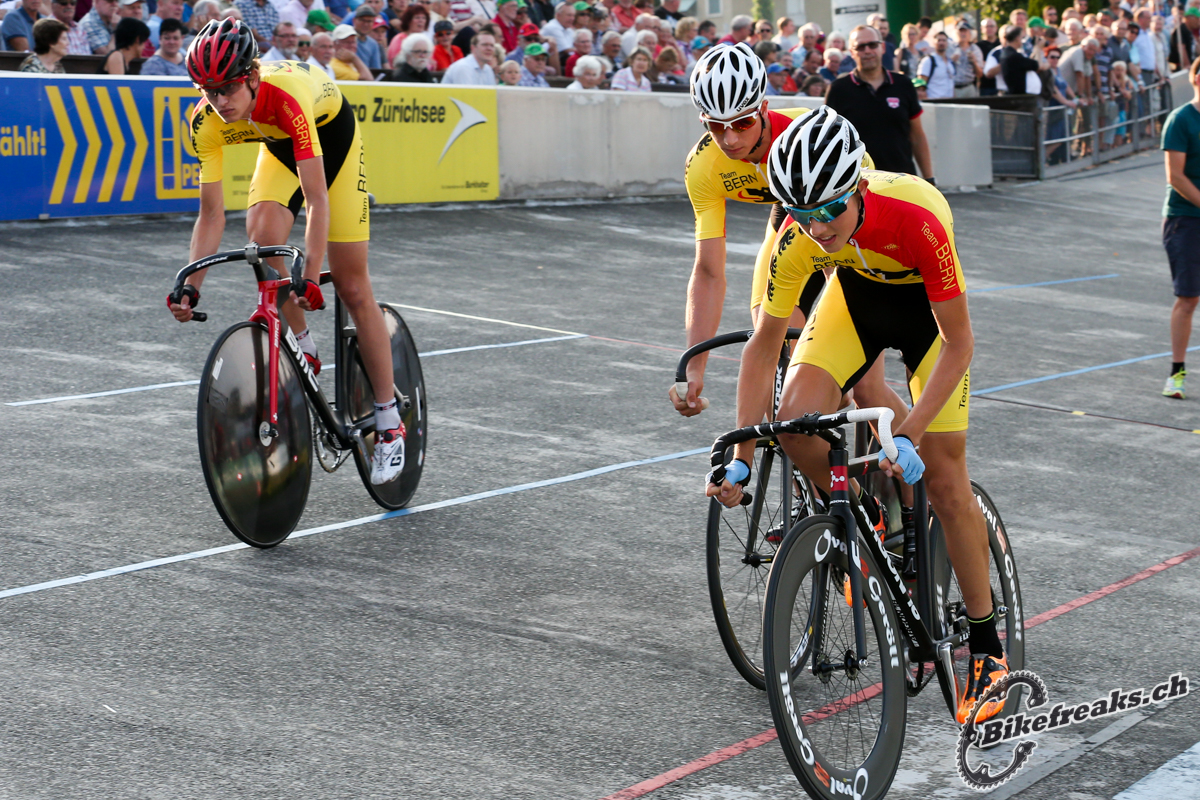 Das erste Rennen des Abends war die Team Sprint Qualifikation. Schon in der Qualifikation konnte man sehen F, dass der Meistertitel nur zu gewinnen war, wenn man Andreas, Reto und Patrick Müller hinter sich lassen konnten. Diesen gelang an diesem Rennabend aber keinem Team, weder in der Qualifikation noch im Final. Den kleinen Final um Platz 3 und 4 fuhr der RV Wetzikon 2 mit Dario Selenati, Elia Wenger und Nico Selenati gegen den VC Hittnau mit Nilas Krucker, Niklas Temperli und Lukas Rüegg. Die Fahrer vom VC Hittnau konnten sich in einem spannenden Endkampf den dritten Platz knapp sichern und so die Bronzemedaille auf dem Podest abholen. Den Finallauf fuhren das Team Züri Oberland 1 mit Felix Stehli, Patrick Bachofner und Chiron Keller gegen die Favoriten vom RV Wetzikon1 Andreas Müller, Reto Müller und Patrick Müller. Die Gebrüder Müller zeigten in diesem Lauf ihre Stärke im Bahnfahren. Sie konnten sich überlegen den Schweizermeister Titel sichern und die Goldmedaille an der Schweizermeisterschaft im Teamsprint abholen. Auch das Team Züri Oberland1 konnte sich über Ihre gewonnene Silbermedaille freuen. Sie fuhren einen sehr starken letzten Lauf an diesem Rennabend.