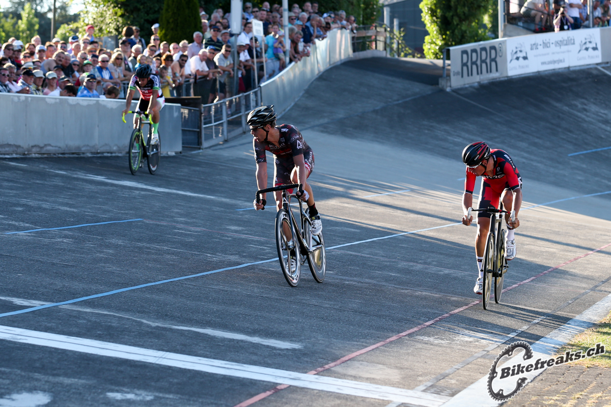 Nach den ersten Demorunden wurden die Bahnräder dann auf die Rennbahn geschickt. Das erste Radrennen des Abends waren ein Ausscheidungsfahren der Nachwuchsathleten. Das Feld blieb das ganze Renne über zusammen. Das Tempo wurde immer mehr angezogen und es war eine spannende Ausgangslage für das Finale. Leider kam es auf der gegen gerade zu einem Sturz alles nur noch 3 Fahrer auf der Bahn waren, wegen den vielen Zuschauern war es nicht sofort klar was passiert war und so wurde das Rennen neutralisiert. Als das Rennen wider angeschossen wurde trugen Hugo Guezennec und Andreas Müller das Finale aus, mit dem besseren Ende für Hugo Guezennec. Andreas Müller konnte sich mit seinem 2 Platz die gesamt Führung im Elektro Zürichsee-Cup zurück erobern.