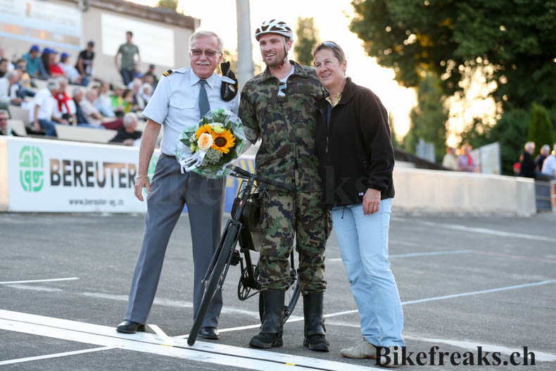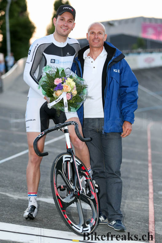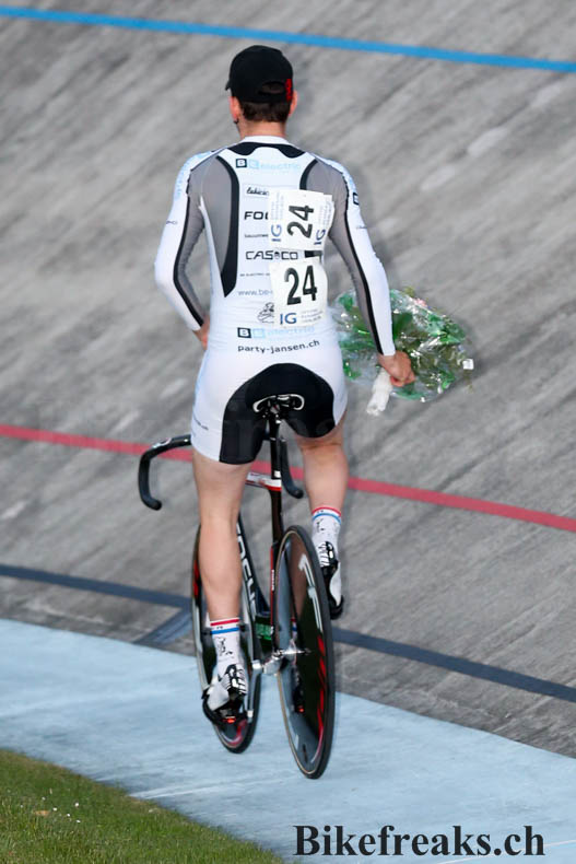 Das letzte Rennen des Abends war eine Rundenzeit fahren mit stehendem Start über die Bahnlänge von 333.333 Meter. David Jansen von Track Team BE Focus legte eine Zeit von 24,615 Sekunden vor, das ist eine Geschwindigkeit von 48,702 km/h. Als letzter Fahrer startet Jan Keller er zeigte eine starke Runde, hatte aber ein paar kleine Unsauberkeit auf dem Rad, so konnte er David Jansen nicht mehr von der Spitze verdrängen. Nach Seriensieger Reto Müller konnte nun auch David Janzen seinen zweiten Blumenstrauss des Abends abholen.
