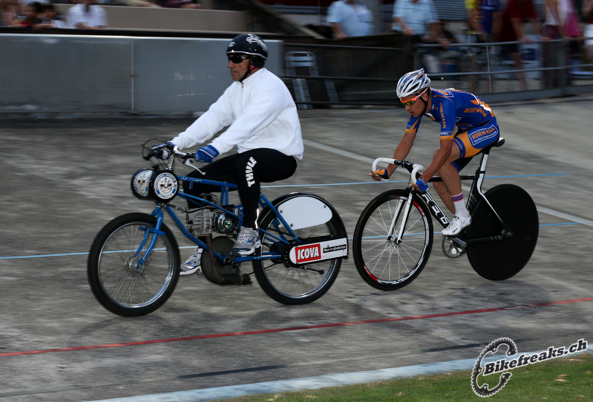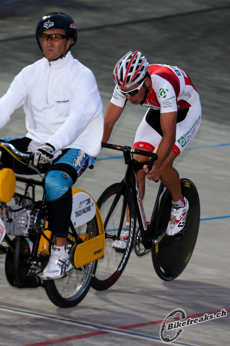 Der erste Derny Lauf des Abends, der zum Wullschleger Derny-Cup zählte, wurde pünktlich gestartet. Leider spielte das Wetter nicht ganz mit. Es fing mit grossen Tropfen an zu regnen und das Rennen musste kurz unterbrochen werden. Zum Glück war der Regen nur von kurzer Dauer und nach einer 10 Minuten Pause konnte der erste Derny Lauf fortgesetzt werden. Der zweite Start erfolgte in der Reihenfolge der Platzierungen vor dem Abbruch. Auf den ersten Platz war Claudio Imhof, zweiter Peter Studer, Dritter Jan Freuler und vierter Pascal Dieterich. Claudio Imhof gab vom Start weg ein hohes Tempo vor und konnte auch gleich ein abstand zwischen sich und das Feld legen. Aber der an diesem Abend starke Pascal Dieterich gab sich nicht geschlagen und nahm die Verfolgung auf. Er schaffte es zu Claudio Imhof aufzuschliessen und die beiden zeigten ein hochstehendes Derny Duell. Claudio Imhof konnte mehrere Wertungen auf seiner Flucht gewinnen und die wichtigen Punkte gegen Pascal Dieterich einsammeln. Womit er schon vor der letzten Wertung als Sieger feststand. Der letzte Sprint des ersten Laufes konnte sich dann doch noch Pascal Dieterich mit grossem Vorsprung sicher. Er belegte den guten 2. Rang. Jan Freuler wurde nach einem harten Kampf mit mehreren Gegnern guter dritter.
